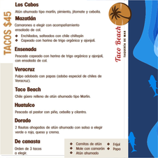 Tacos de camarón, pescado, atún ahumado tipo marlin, pulpo. Tostadas de aguachile de camarón, ceviche de pescado y atún. Coctel y consomé de camarón, quesadillas, empanadas, tacos de canasta y snacks. Postres artesanales. Micheladas y variedad de drinks. Tenemos servicio a domicilio. Contrátanos para tus eventos